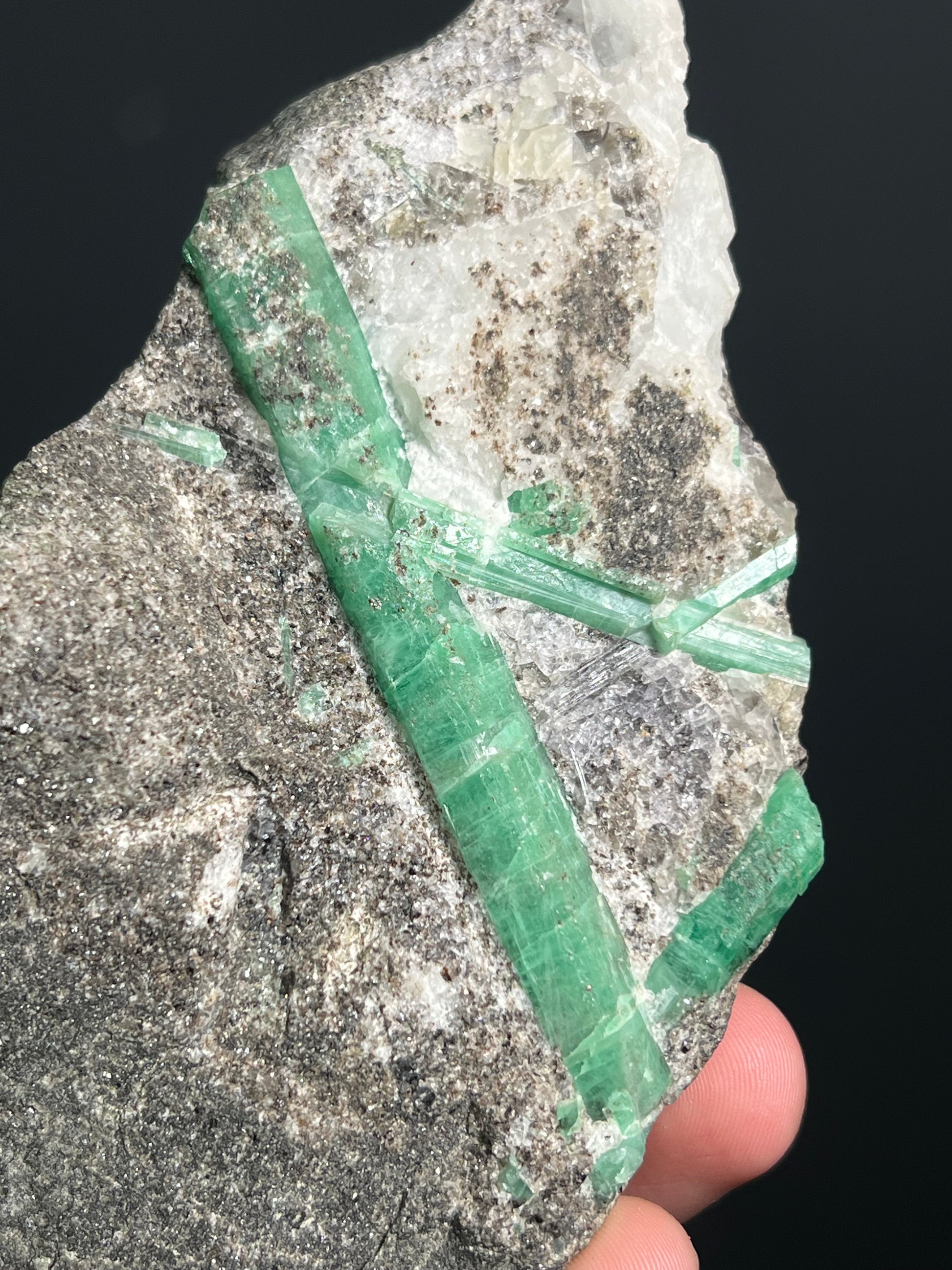 The rich green tones of the emerald contrast elegantly with the bright, glassy quartz crystals, creating a visually captivating composition. This natural pairing highlights the fascinating geological processes that allowed both minerals to form together, giving the specimen a unique character and strong aesthetic appeal.